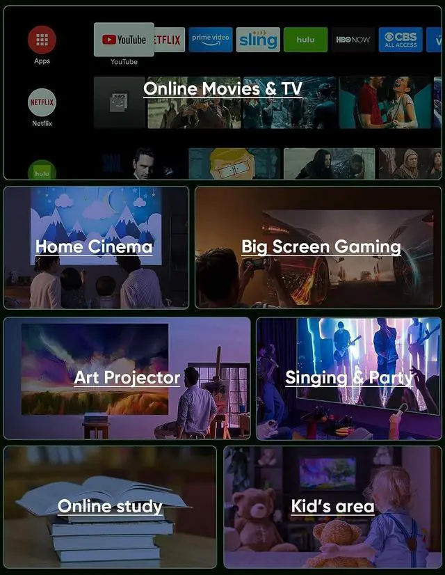 Wider Compatibility This 1080P HD projector is featured with multiple ports for ease of use, including a HDMI, USB, TF and 3.5 mm audio interface. It's the perfect solution for a wide variety of inputs including but not limited to TV Stick/Box, Chrome-cast, Roku-Stick, Game Console, PCs, Smartphone & Laptops, DVD player, micro SD card and USB Sticks, External Speaker etc.