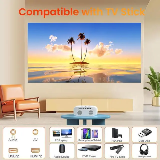 Multi-Support FunctionalityHAPPRUN movie projector has a 2xUSB/2xHDMI/AV/Audioport, compatible with Smartphone/Laptop/U Disk/DVD Player/PS5, etc. (Netflix, Prime Video, Disney, Hulu, etc. due to application copyright The video does not support direct mirroring on the phone, it can only be played by connecting a laptop, Chromecast, wireless dongle, TV stick or Roku)