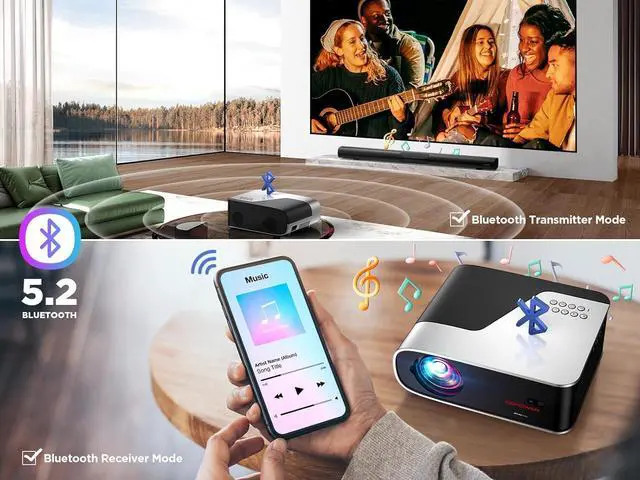 Bluetooth 5.2 /Dolby AudioG01 Projector with wifi and bluetooth supports two-way Bluetooth 5.2 audio transmission, either can be connected mobile device to be used as a standalone stereo speaker, or paired with external Bluetooth speaker/headphone/soundbar to enhance audio effects for home projectors anytime and anywhere. The home theater projector with Dolby Audio supports 360°stereo surround sound for immersive cinema-like fun. Bluetooth projectors only supports audio NOT video transmission.
