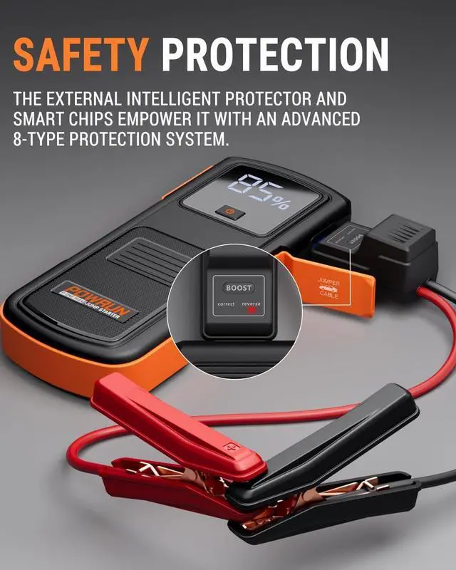 PERFECT DESIGN: The portable jump starter for car battery comes with a large display screen, giving you a clear view of usage status and remaining power. It's user-friendly for all users, waterproof (IP65), dust-proof, and shock-resistant, ensuring safe operation in all weather conditions.