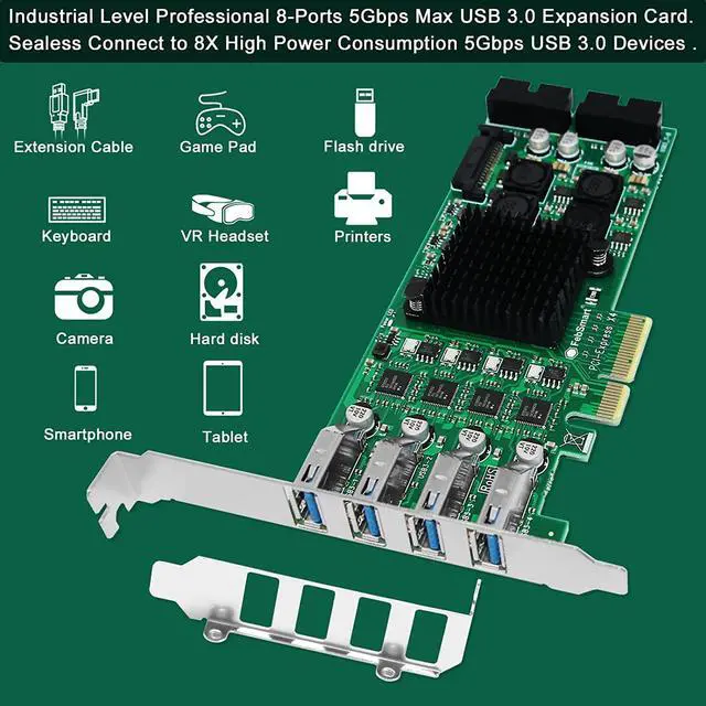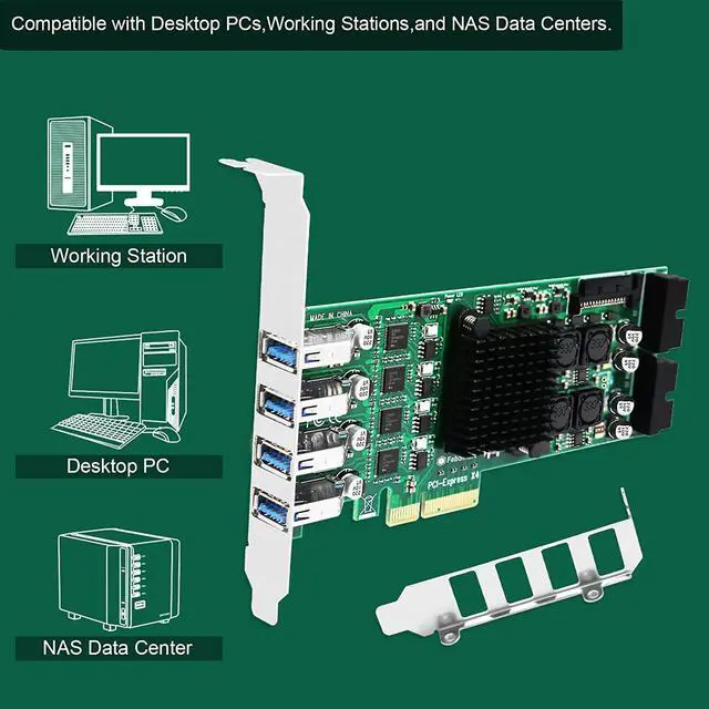 5. PCIE X4 interface design, will works on PCIE X4, X8, X16 slot. Do not work on PCIE X1, X2 slot, do not work on PCI slot. Based on PCIE 2.0 standard, will compatible with PCIE 1. x, 2. x, 3. x, 4. x PCIE slot. The full height bracket mounted on this PCIE USB 3.0 expansion card, will works on Standard Size PCs. The low-profile bracket in the package, will supports Slim PCs.