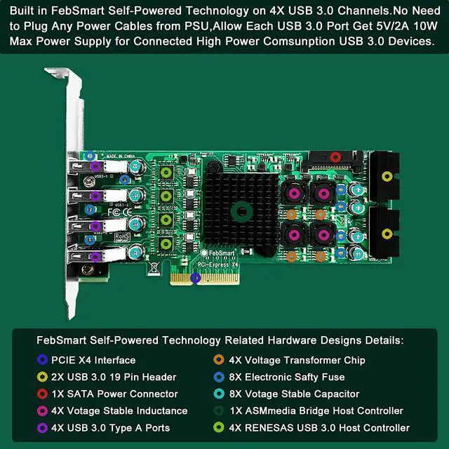 3. Built in FebSmart Self-Powered Technology, no need to plug any additional power cables from Desktop PCs Power Supply Unit. Allow each USB 3.0 channel two USB 3.0 ports get 5V/3A 15W (5V/12A 60W in total) max power supply from motherboard for connected high power consumption USB 3.0 devices. FebSmart add 8X electronic safety fuse and 8X voltage stable capacitor and 4X voltage stable inductance on the USB expansion card, will protect users data and USB 3.0 devices, make sure safe connection.