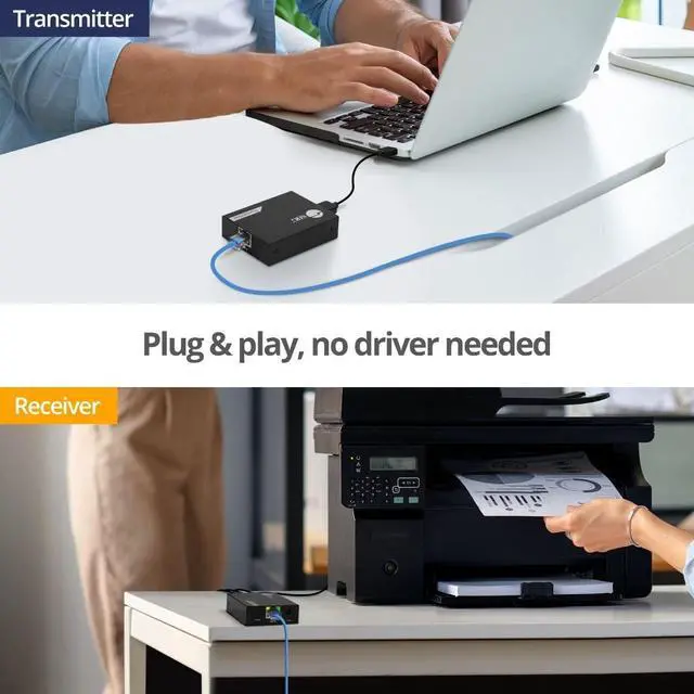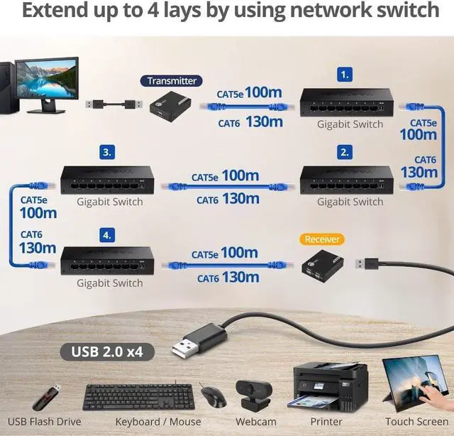 High-Performance Connectivity - This powered USB extender supports cascading connection, connecting up to 4 layers which allows you to connect multiple devices at a time through unmanaged dedicated Gigabit Ethernet routers or switches.