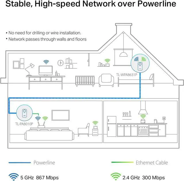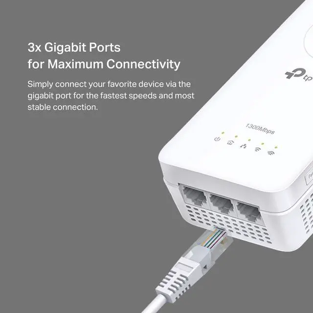 Wall-Piercing Wi-Fi Extended to Every Outlet AV1300 Gigabit Passthrough Powerline ac Wi-Fi Kit TL-WPA8631P KIT Dont Lose an Outlet The passthrough powerline kit can be used like a traditional electrical socket, ensuring no power socket goes to waste. The built-in noise filter helps prevent electrical signal noise from affecting powerline performance. More Gigabit Ethernet Ports, More Devices Equipped with 3× gigabit Ethernet ports, the kit provides wired connections for 4K video, IPTV streaming, lag-free gaming, and more.