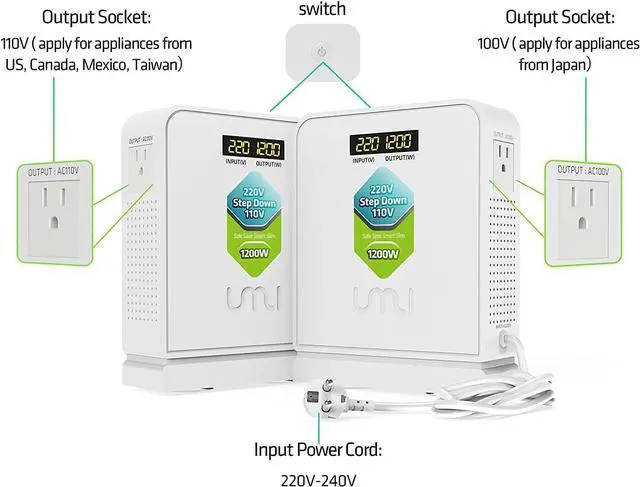 2 outlets: can use 2 equipments (one is with 110V, the other one is with 100V) simultaneously, just the total power consumption not exceed the rated power(1200W) of the converter.