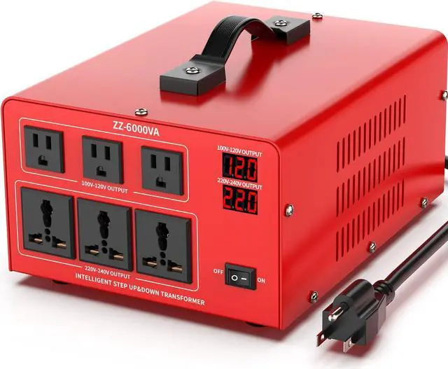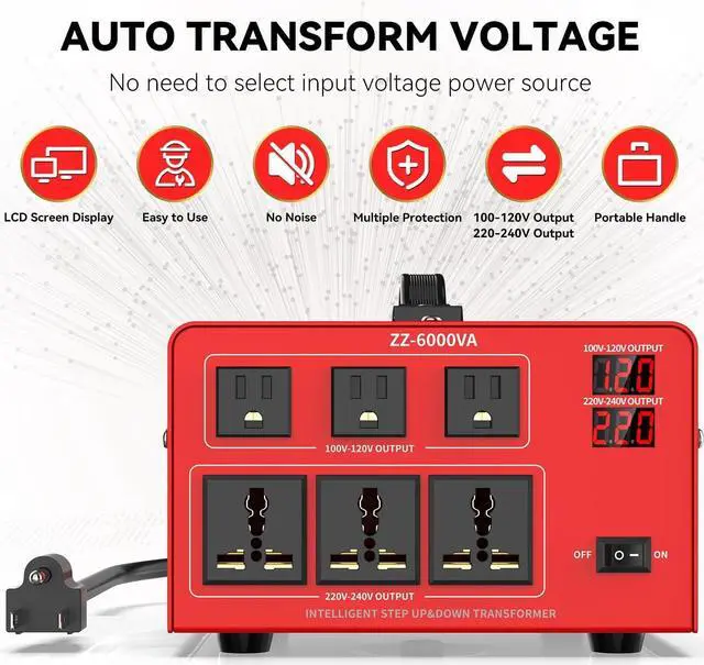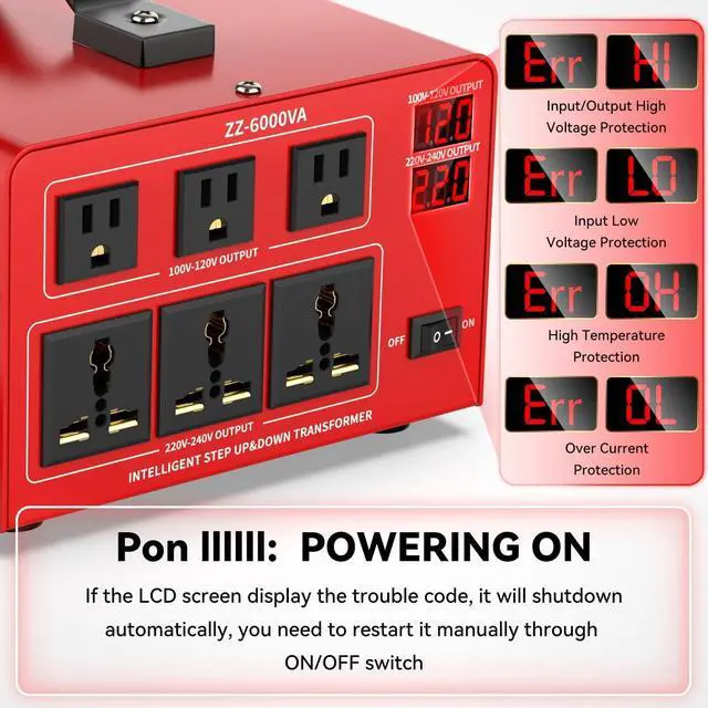 LCD DISPLAY SCREEN- This 6000VA heavy duty voltage converter comes with LCD display screen, it will show the output voltage, and when converter shutdown due to high voltage, low voltage, high temperature, over current or overload, it will display the trouble code to help you troubleshoot the problems.