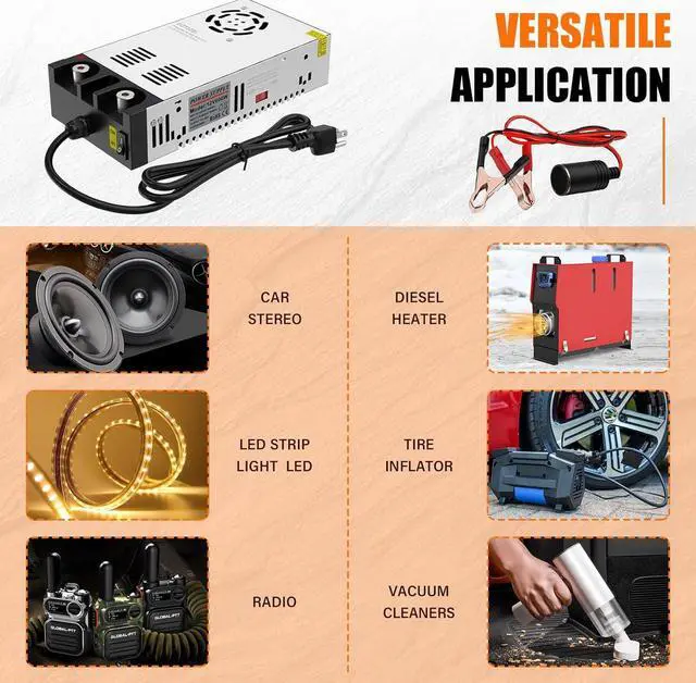 Widely Applications power supplies for devices different currents/watts. Used for DC 12V Pump, PCP Air Compressor, Winch, Car Jack, Car Stereos, Amplifier, Radios, LED Light Strip, Brushless Motor, Household Appliances, Electronic Devices, Automation Equipment, Computer Project, Servos, Tire Inflator, Vacuum Cleaners etc.
