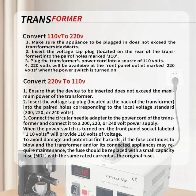 Please NoteThis transformer only converts the voltage, not the frequency hz. Heating appliances, power tools, motors, and coffee makers are recommended to choose a transformer with more than 2 times power.