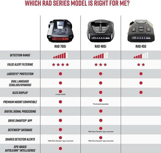 The RAD 480i is the best performing radar detector in its class with 2x the detection range of its predecessor for advanced warnings plus next gen IVT filtering to eliminate unwanted alerts. Get all speed and red light camera notifications plus real-time shared alerts from the Cobra community. Get 2x the range plus enhanced Digital Signal Processing (DSP) for rapid warnings with this police scanner, the best of radar detectors for cars. Bluetooth connectivity allows you to access the Cobra community and receive real-time driver alerts from the Cobra iRadar app. Share and receive real-time alerts from the Cobra driving community.