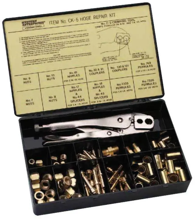 Convenient plastic case is durable and includes a full color label and description chart. Hose repair kits include crimping tool, nuts, couplers, splicers, nipples and ferrules.