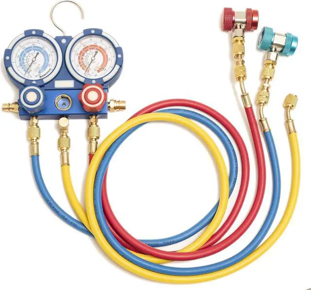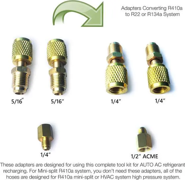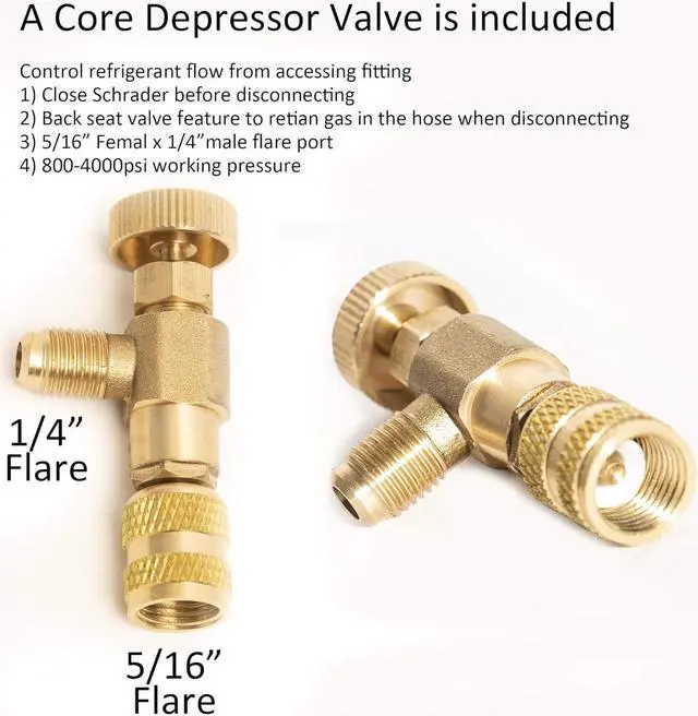 Hoses and Accessories - The kit comes with a set of high-quality hoses that are designed to withstand high pressure. The hoses are color-coded for easy identification. The kit also includes other essential accessories for AC repair. Brass 'Quick Seal' fittings - 45 degree on one end, straight on the other - providing a leak-free seal. Sets of 6 inches long, 1/4 inch yellow, blue, and red hoses; 800 PSI working pressure; 4000 PSI burst pressure,