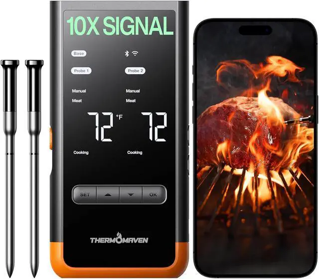 Two Ultra-Thin Probes: Allows you to monitor time and temperature for two different dishes at once. The ultra-thin design preserves the integrity of your proteins and retains their juices, ensuring perfectly cooked meat every time.
