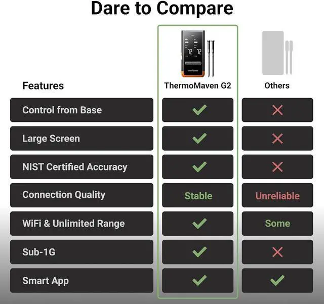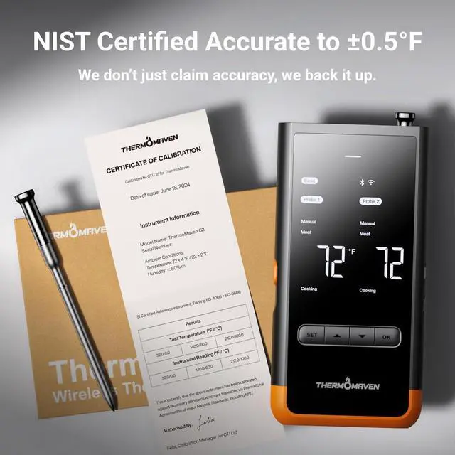 Accuracy: Equipped with 6 sensors (5 internal and 1 external), the precision of ThermoMaven G2 is NIST-certified, delivering ± 0.5 °F accuracy and 0.01 °F resolution. You can confidently ensure your food is never undercooked or overcooked.
