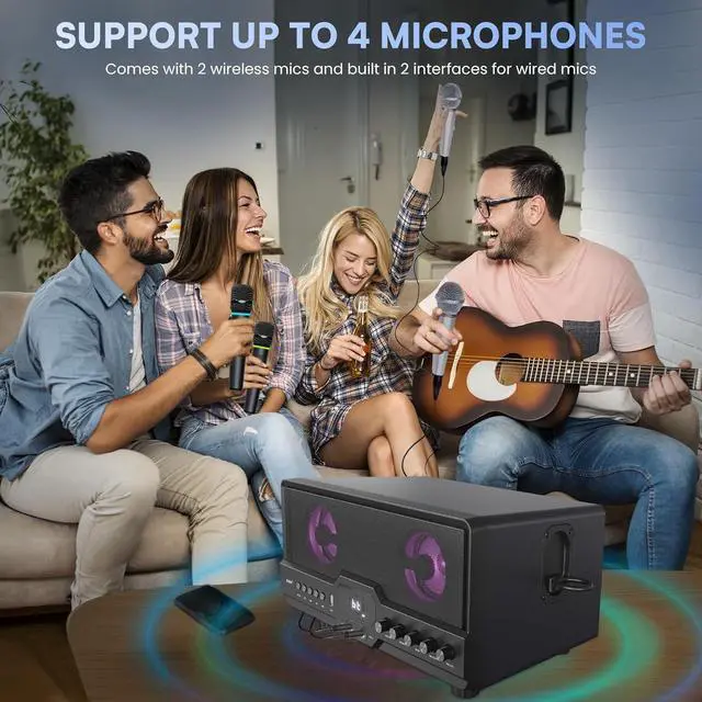 WITH COLOR CHANGING LED LIGHTS: Equipped with led lights, just need to press the button on the speaker to turn it on. There are 2 lighting modes and each mode with 7 color changing. The colorful LED lights that sync with the music, adding an exciting atmosphere to your karaoke sessions. It can be turned off anytime if you don't like LED lights.