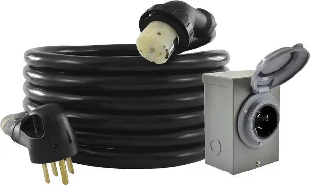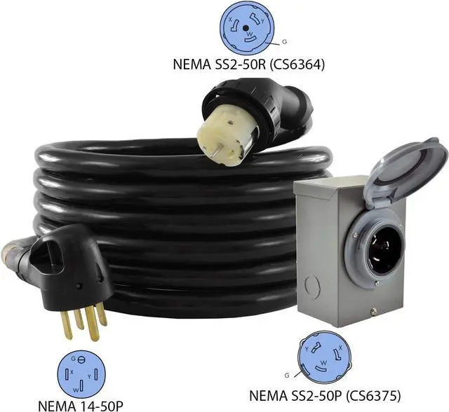 Power inlet boxes run power to critical electrical systems while avoiding harmful exhaust fumes that a generator produces. Simply mount the box on the exterior of a home/business, and run the wiring to a transfer switch/box installation. When emergency power is needed, connect a generator cord to the inlet box, and flip the switch for the transfer unit. These boxes are equipped with a SS2-50 (CS6375) male configuration for large systems. 25FT 50Amp DUO-Rain Seal Kit Temporary Power Cord NEMA 14-50P Generator Plug to CS-6364 Connector With 50-Amp Connections Power Cords are manufactured using 600 volt Type STW cable Type. Stays flexible in cold weather, Heat Resistant up to 221F.