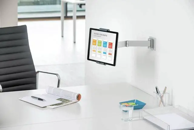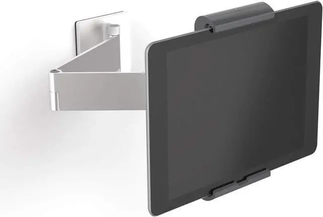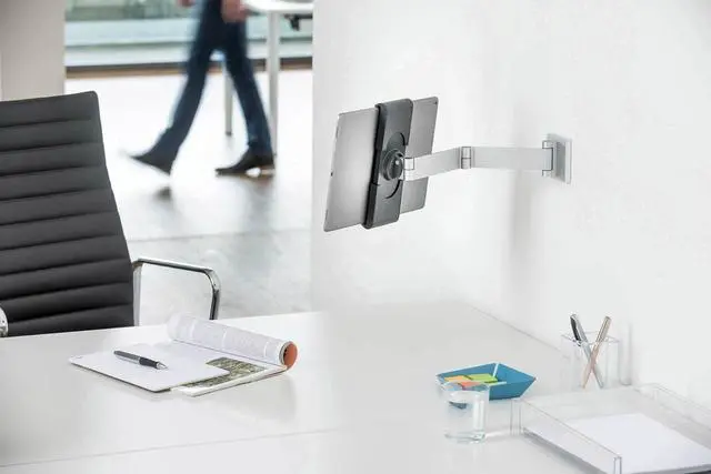 Versatile: The wall tablet holder with swing arm is perfect for workplaces with interactive information points. The wall tablet holder with swing arm offers a high degree of flexibility, ensuring optimal readability when the tablet is fastened to walls.