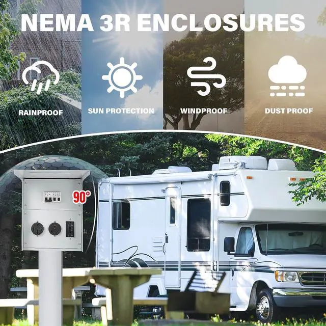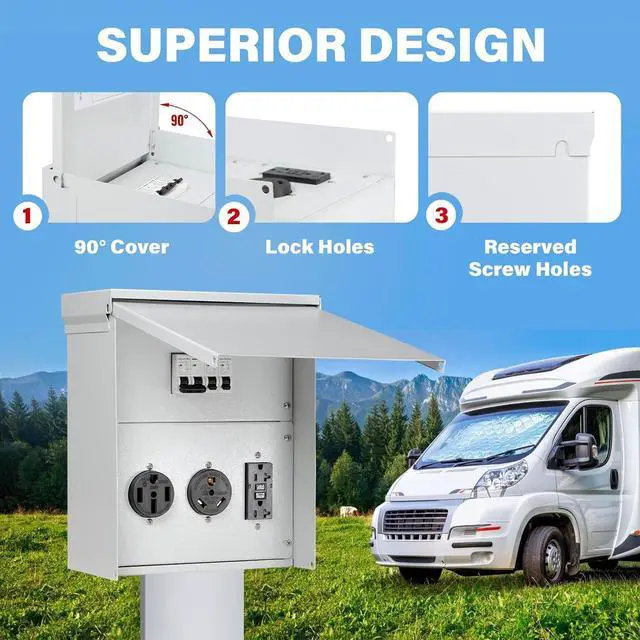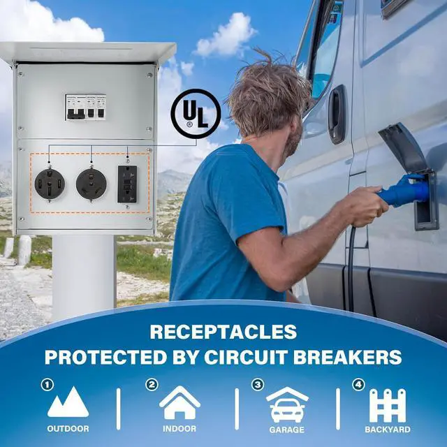 UL CERTIFIED The Temporary Power Outlet Panel features receptacles with UL certification, including 50 amp, 30 amp, and 20 amp options. Each receptacle is protected by its corresponding circuit breaker, ensuring optimal electrical safety for your daily usage.