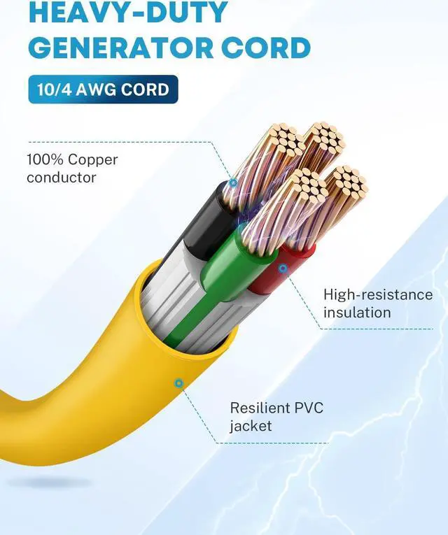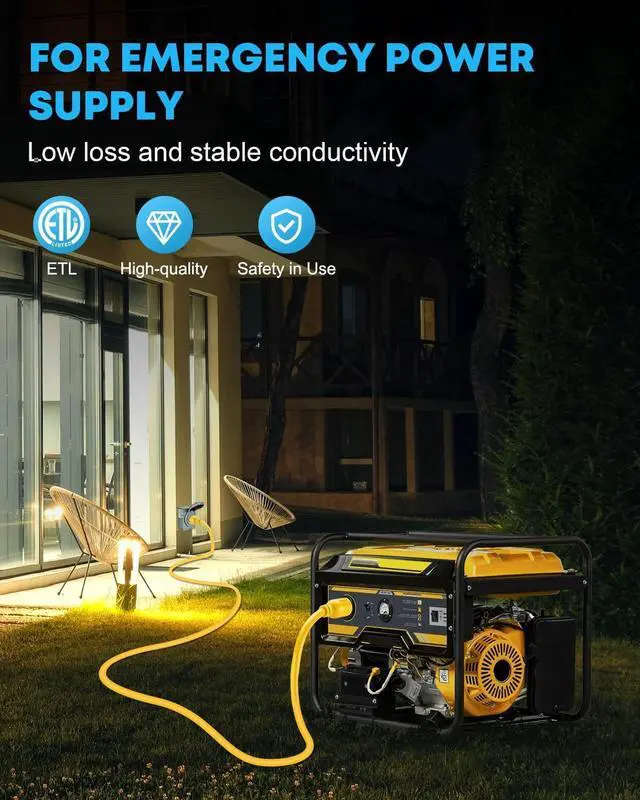High Conductivity Generator cord 10 gauge cable 30A 125/250V up to 7500W with a greater conductivity, and will avoid getting overheating from long time use, a useful and reliable emergency electric extension cord for your generator.
