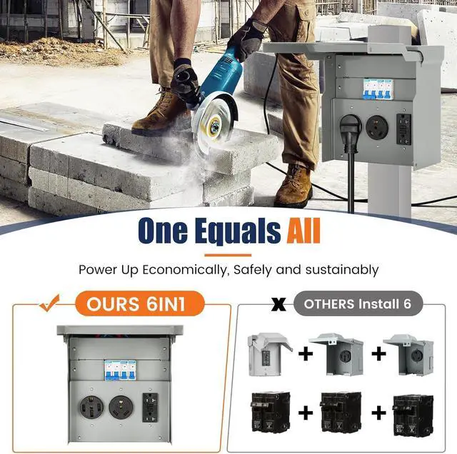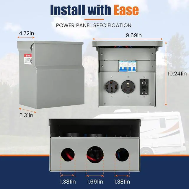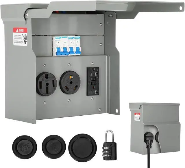It includes all necessary components and can connect to either copper or aluminum wire for flexible installation options. Additionally, the outlet cover can stay open at a 90-degree angle for hands-free operation during wiring, further enhancing ease of use VERSATILE APPLICATION & GUARANTEE Designed for multiple applications including RV parks, construction sites, garages, and more, this RV Breaker Box provides a safe and reliable power source for a variety of electrical needs. With a satisfaction guarantee and 24/7 customer support, any issues or concerns can be quickly addressed for complete customer satisfaction