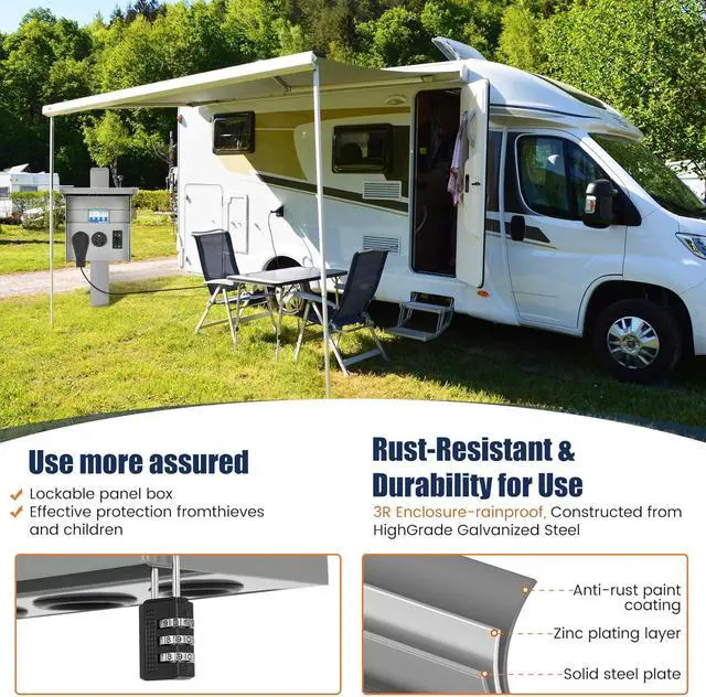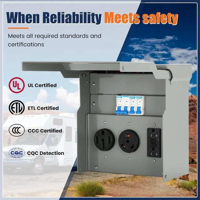Application: RV, Camper, Travel Trailer, Generator & Outdoor SAFETY & CERTIFICATIONS RV Electrical Outlet are ETL certified, every outlet (20A, 30A and 50A) is ul certified, and every circuit breaker is also CQC tested and CCC certified, ensuring safety during power distribution. The panel has been thoroughly tested and meets the highest industry standards, providing peace of mind and preventing electrical hazards. This makes it perfect for use in a variety of settings from RV parks to construction zones WEATHERPROOF & DURABLE This RV Panel 50 30 20 features advanced weatherproofing capabilities including waterproof, fire-resistant, dustproof, and UV protection. Its robust construction ensures the outlet box can withstand the elements such as rain, snow, oil, and extreme temperatures, making it ideal for both outdoor construction sites and recreational vehicles SIZE & MATERIAL The 50/30/20 AMP RV Outlet Box is crafted from heavy-duty cold-rolled steel with a durable corrosion-resistant coating. The overall dimensions are 16.5"" high x 10.24"" wide x 5.9"" thick, providing ample internal space for safe and easy wiring. The high-quality materials ensure long-lasting protection even in harsh outdoor environments EASY INSTALLATION The RV Outlet Box comes fully pre-wired and ready for installation, significantly reducing setup time and complexity.