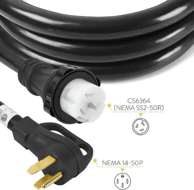 Male plug is NEMA 14-50P, 50A, 250V, 12500W; Female receptacle plug is NEMA SS 2-50R, 50A, 250V, 12500W with locking threaded ring; 50A generator outdoor extension cord waterproof constructed with heavy duty STW 6/3 + 8/1 AWG generator power cord; 50 amp rv cord all UL and ETL certified