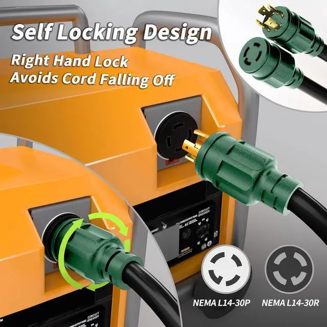 Storage: L14-30 generator power cord 25 ft jacket is made with solid and flexible material; allowing for easy bending and storage; adapting to different layouts and environments; additionally; equipped with an adjustable cord organizer that enables neat coiling of the cord and hanging; making storage and transportation easier and preventing tangles and messes
