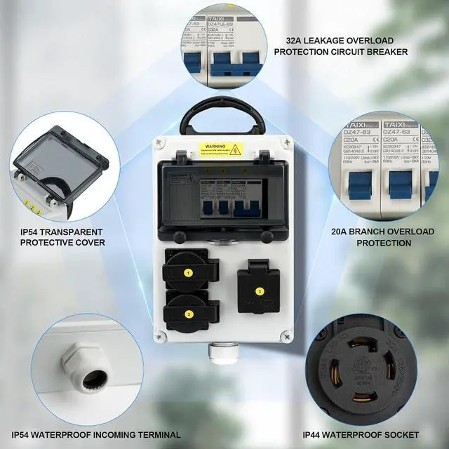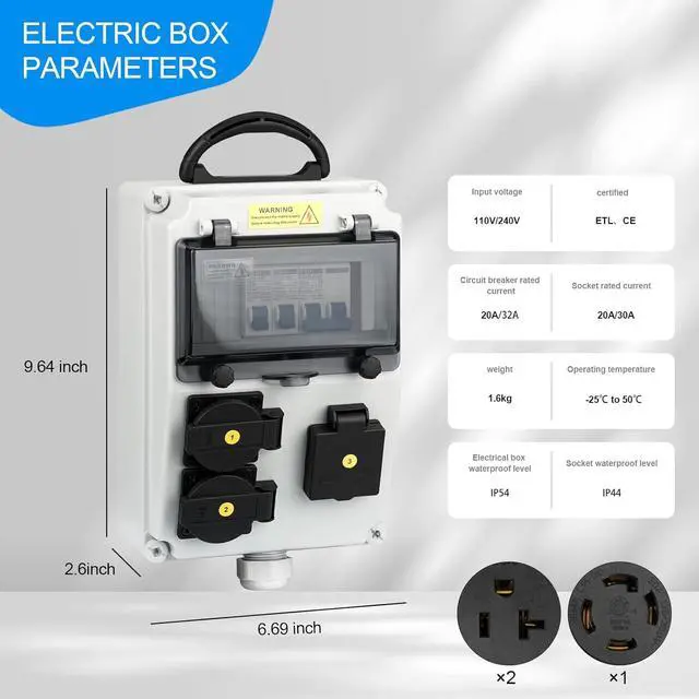 SAFE AND RELIABLEThis electrical outlet box comes with 2 NEMA 5-20 and 1 NEMA L14-30 IP44 waterproof sockets, each with a circuit breaker protection to ensure the safety of electrical equipment in each socket. The sockets and circuit breakers have ETL and CE certifications.