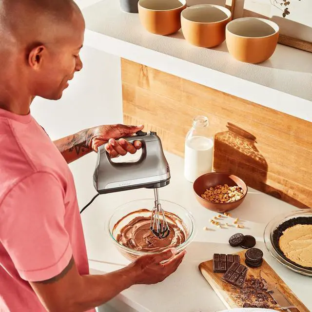 Compact, lightweight and great for your everyday mixing needs. This hand mixer features 6 speeds, 2 Flex Edge Beaters and the power and control to mix up your favorite cookie dough, mashed potatoes and so much more. Slowly stir in chunky ingredients, like nuts or chocolate chips, at speed one or whip egg whites or heavy cream at speed six. The Flex Edge Beaters deliver 2X the surface area for faster, more thorough mixing, * and also reduces the need to scrape down sides of the bowl, when compared to metal beaters.