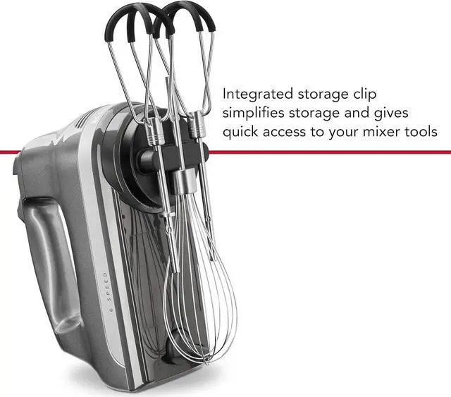 Securely store your accessories with the integrated storage clip that attaches to the underside of your mixer, eliminating the need for bulky containers and/or storage boxes.