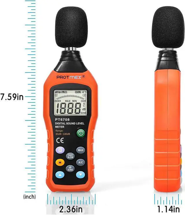 ANTI-SLIP AND ENERGY-SAVING SPL METER The decibel gauge used a composite material injection molding process with an anti-drop structure design, power saving, high reliability, and high-efficiency circuit, easy to use in multi-environments. The Protmex noise meter with the backlight feature is appropriate for gathering sound data at night. To save power, the backlight auto power-off function is provided.