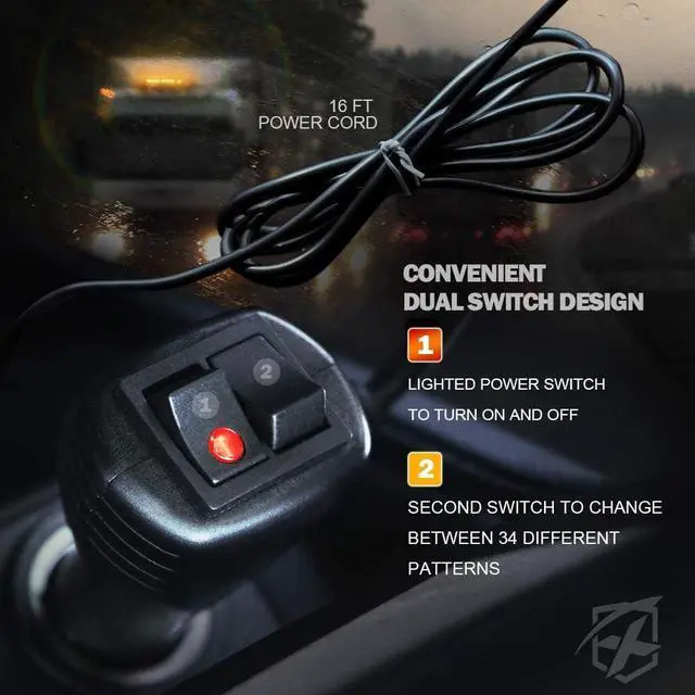 Dual Switch Control: Double side flashing light bar has an easy-to-use power switch and a separate switch to toggle between 21 flash patterns. Includes a 16 FT straight cable with a 12V cigarette lighter plug for convenient power access.