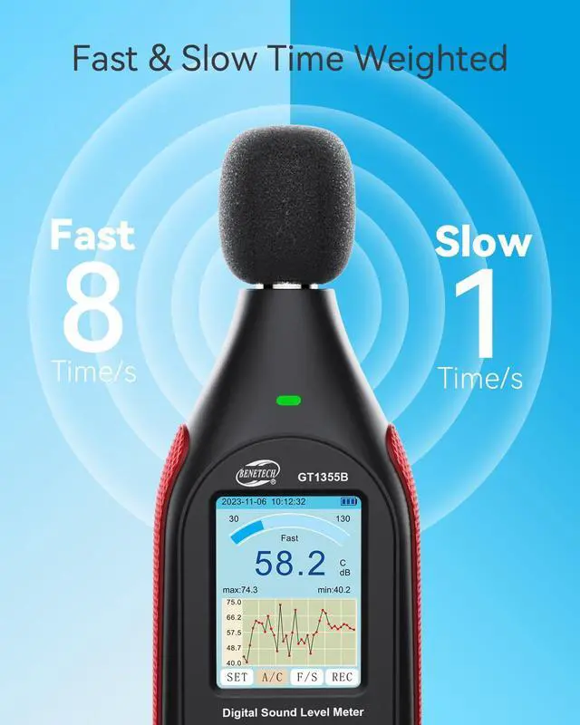 Real-Time Monitoring & Recording: The sound pressure level (SPL) meter is capable of storing up to 43, 000 sets of data and import the data saved to a PC via the USB port for real-time data sampling and analysis, data downloading, printingcharts/data reading, and deletion. Additionally, you can set the date, configure an automatic shutdown time, and low battery indicator to remind you when it's necessary to recharge