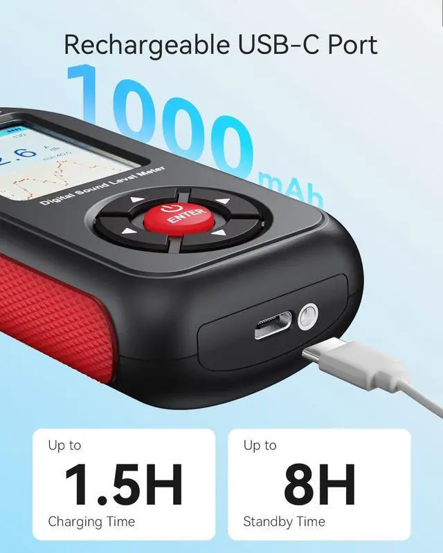 Lightweight & Long-Lasting: This noise level meter features non-slip rubber grip and weighs just 4.23 ounces, making it convenient to carry around. The decibel meter boasts 1/4-inch mounting threads on its back for attachment to a stand, and can stay in standby mode for up to 8 hours after a 1.5 -hour charge for extended monitoring