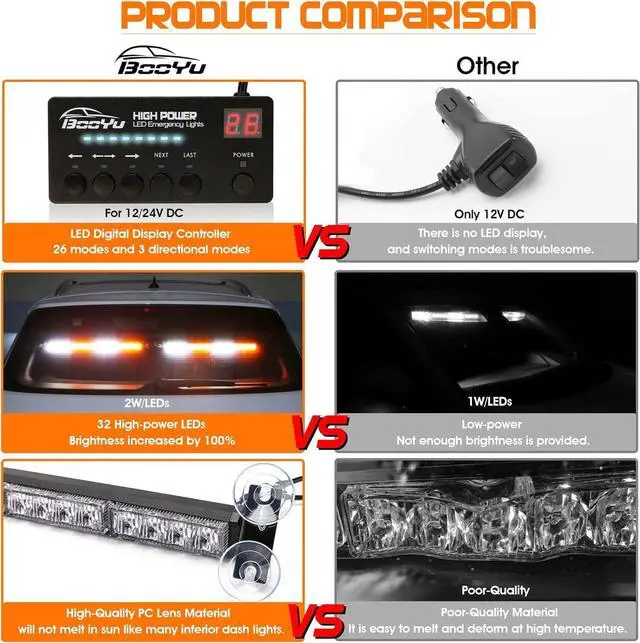 HIGH QUALITY -- Exterior consists of aluminum alloy housing with a steel bracket and PC Lens Material to endure all kinds of weather conditions, this LED strobe light will not melt in sun like many inferior dash lights.