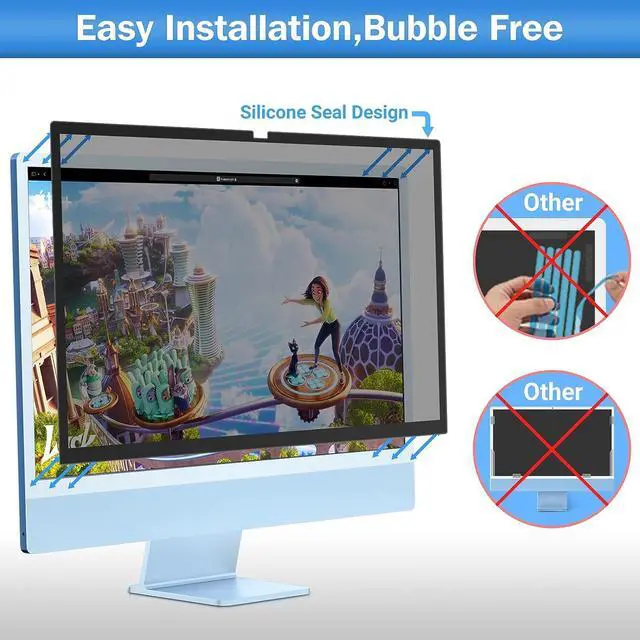 4. Easy To Install- imac privacy screen protector 24 inch adoption latest black frame silicone seal design, Before installation, Clean the screen and ensure it is dust-free, align the product to the screen, gently press over on the frame to remove the bubbles, and let the silicone adhered to the frame. easy to install and remove, 100% bubble-free. No need for plastic labels or tape to hold monitor privacy screen in place. Easily remove and reattach when you need it.