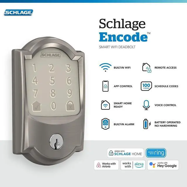 Schlage encode smart Wi-Fi deadbolt offers peace of mind from anywhere by allowing you to remotely manage your lock via the Schlage home app or Key by app. Theres no need to purchase an extra accessory/hub to connect to your lock from anywhere it will connect to your homes Wi-Fi signal similar to your laptop, making it easy and intuitive to use. Graded best in security, durability and finish by industry experts, Schlage encode smart Wi-Fi deadbolt offers the advanced features of secure encryption and built-in alarm technology. This innovative, smart deadbolt is available in a variety of styles and finishes that pair perfectly with Schlage interior door hardware, creating a cohesive look throughout the home.