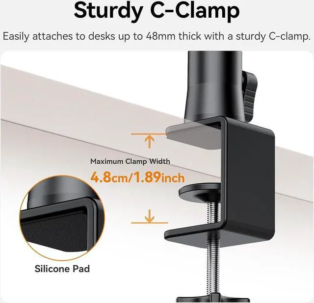 Sturdy C-Clamp: Easily attaches to desks up to 48mm/ 1.89 inch thick with a sturdy C-clamp with