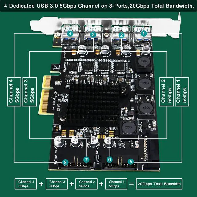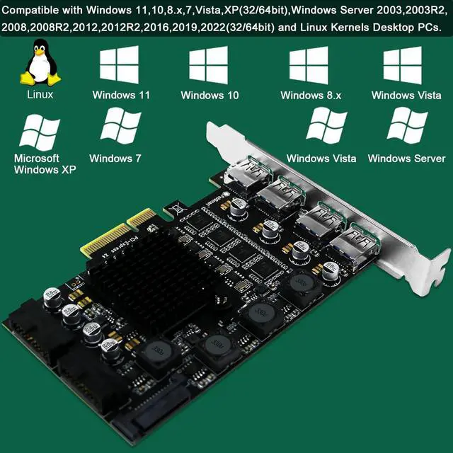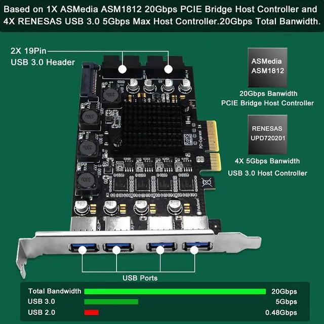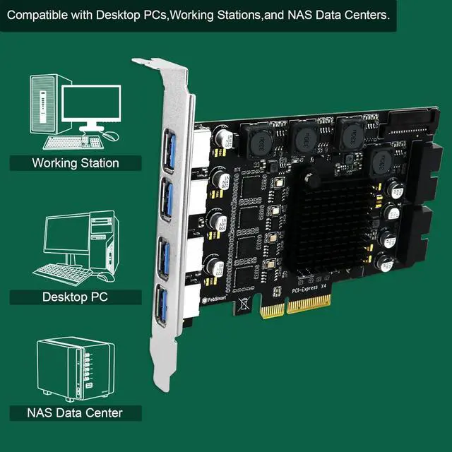 5. PCIE X4 interface design, will works on PCIE X4, X8, X16 slot. Do not work on PCIE X1, X2 slot, do not work on PCI slot. Based on PCIE 2.0 standard, will compatible with PCIE 1. x, 2. x, 3. x, 4. x PCIE slot. The full height bracket mounted on this PCIE USB 3.0 expansion card, will works on Standard Size Desktop PCs, do not support Slim Desktop PCs.