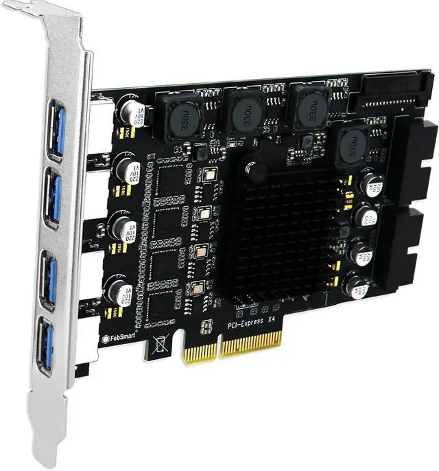 3. Built in FebSmart Self-Powered Technology, no need to plug any additional power cables from PCs power supply unit. Allow each USB 3.0 channel 2X USB 3.0 ports get 5V/3A 15W (5V/12A 60W in total) power supply from motherboard directly for connected high power consumption USB 3.0 devices. FebSmart add 8X electronic safety fuse, 8X voltage stable capacitor and 4X voltage stable inductance on the USB expansion card, will protect users data and USB devices, make sure safe connection than ever.