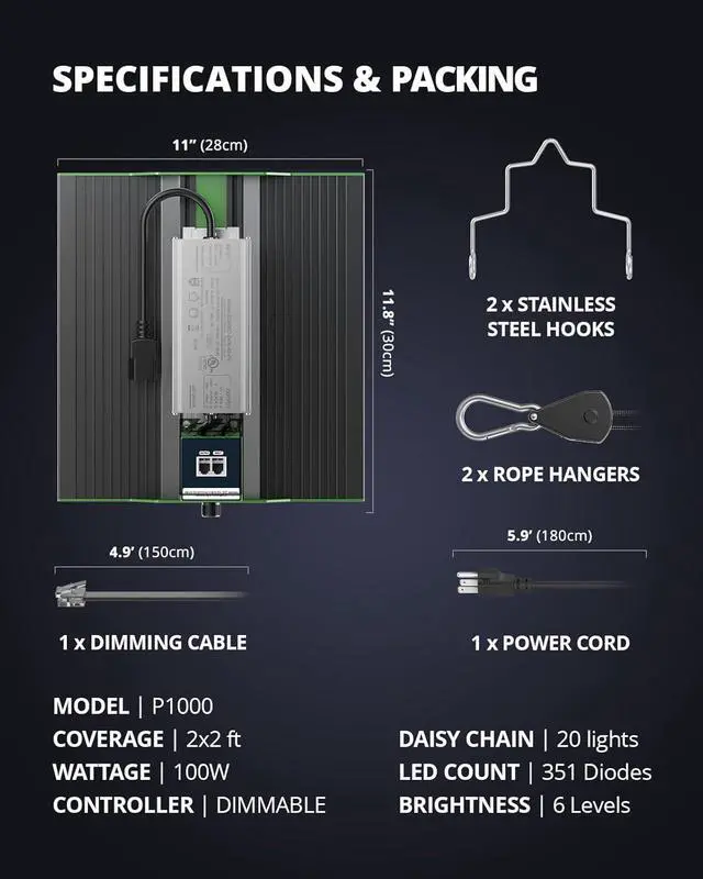 DIMMER FUNCTION & DAISY CHAIN FEATURE: An added dimmer knob is featured to precisely manipulate the brightness level of the light, obtaining perfect growth performance for each growing phase. Daisy chain feature allows you to connect up to 20pcs P1000 grow lights for your commercial growing, horizontal and vertical farming, greenhouse planting and hydroponics etc.