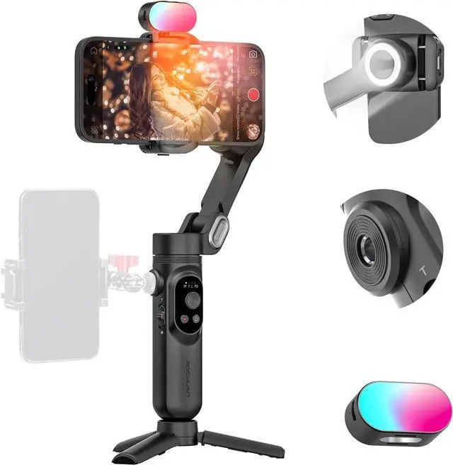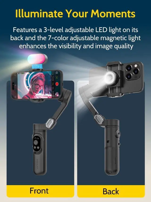 [RGB LED Light] The 7-color adjustable magnetic light helps to shoot with a suitable background color, just attached magnetically to the smartphone gimbal stabilizer or other equipment. Its efficient battery offers up to 180 minutes of use at full brightness and up to 5 hours on the lowest setting. This makes it an excellent choice for YouTubers and bloggers who ask for more creative scenarios when recording videos or vlogging.