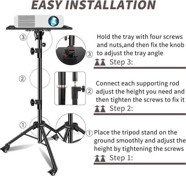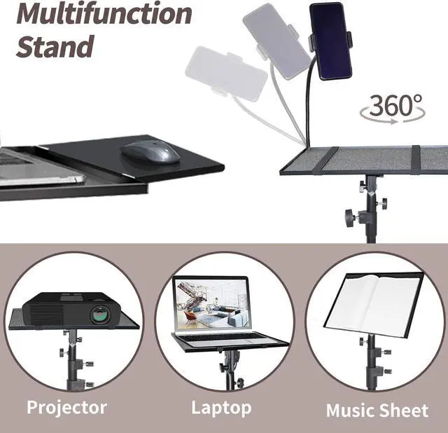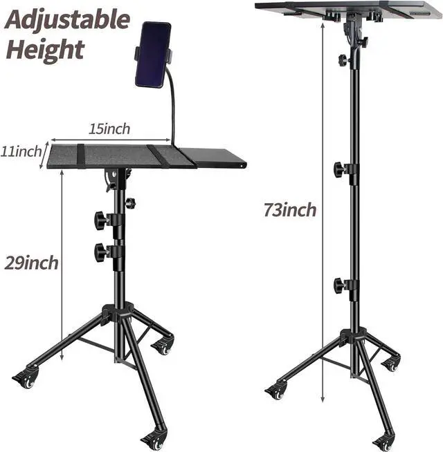 Adjustable Height The laptop floor stand tray measures 15 by 11 inch, portable laptop tripod can adjust height from 29 to 73 inch, This tripod projector stand features -5° and +45° tilt on two sides,