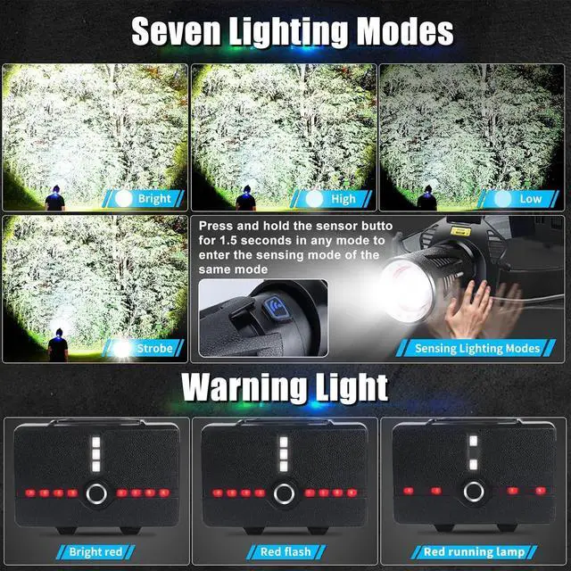 INDICATOR WARNING HEADLIGHT--Enter the induction mode, the blue indicator light is always on. Four white LEDs in the battery compartment display the power level: the indicator light is flowing/charging, and the last bar flashes below 10%. Let you know the headlight power at all times