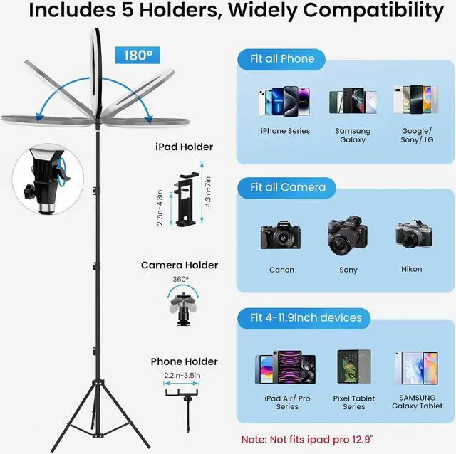 Tablet Holder and 3 Phone Holder: tablet holder+ cold shoe adapter for most DSLR cameras + 3PCS smartphone holder. Equipped with tablet holder fits any 7 to 9-Inch tablet devices (Note: NOT compatible with 12.9 ). tablet ring light with tripod stand photo booth, tablet tripod stand is suitable for food production, painting, crafting, online teaching, live streaming, make-up, zoom sessions, video recording, tattooing, live game Broadcast, indoor shooting, nail light, salon, live travel, vlog, zoom meeting, group selfie, barber and photography