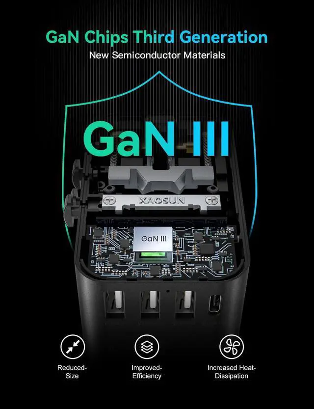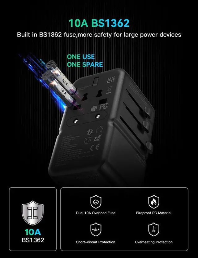 Portable and Safe: Advanced GaN technology compresses this travel adapter to a compact size ( 2.8 x 2.1 x 2.1 inches) It features GaN cooling and fireproof PC material. Additional safety includes a 10A overload dual fuse, safety shutters, and a plug lock system, offering short circuit, over-voltage, and over-current protection. Certified by RoHS, CE, and FCC, it effectively avoids charging dangers.