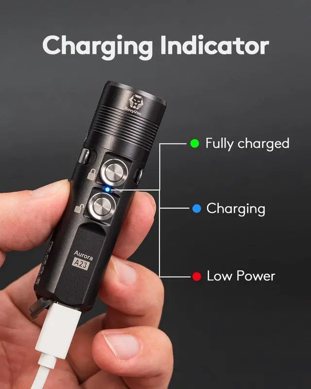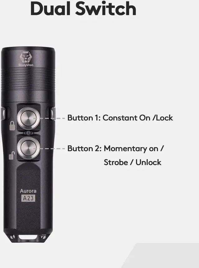 Lockout and Momentary on Features: The RovyVon rechargeable flashlight has momentary on mode. You can access to it quickly by pressing and holding the first button for urgent or temporary use. And it also has the lockout feature to avoid turning on by accident.