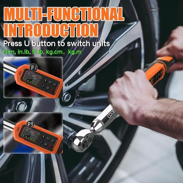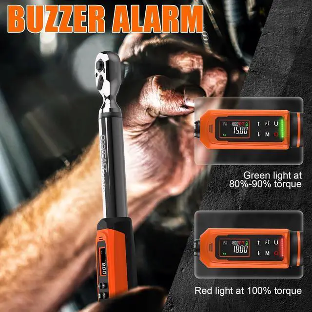 LARGE COLOR SCREENThe large LCD display is very easy to read and use and the high-backlight screen display can be used in dim environments. Torque wrench 3/8 drive will vibrate, buzzer and led indicator to alert you when the applied force is about to reach the preset value, the green light at 85%-90% and the red light at 100%.