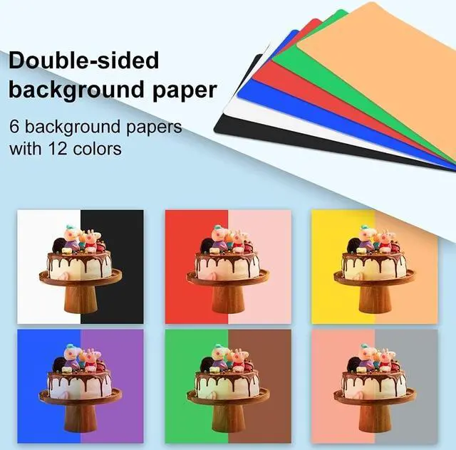 Multi-color Backdrops -- With 6 removable different color backdrops paper, it is double-side different color, total 12 colors will be sent out together with the photo studio light box.