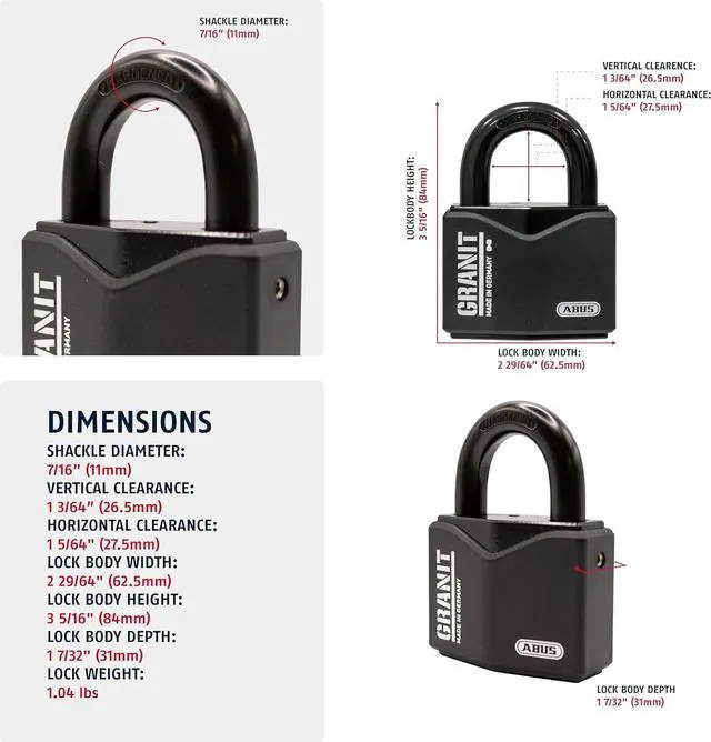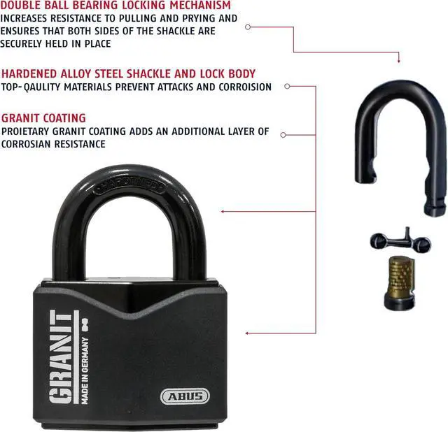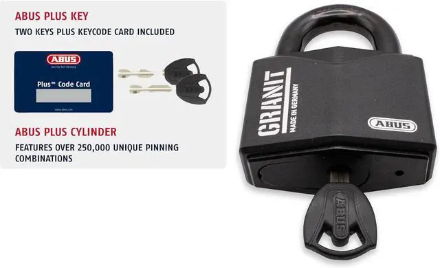 ABUS Granit padlocks meet highest security standards and are considered to be among the most secure padlocks in the world. Their tensile resistance is over 6 tons. High-quality materials and careful finishing are the basis for the quality of these padlocks that are made in Germany. Innovative luminous keys and the black Granit coating for optimal corrosion protection are characteristics of the product series. The ABUS-Plus disk cylinder.
