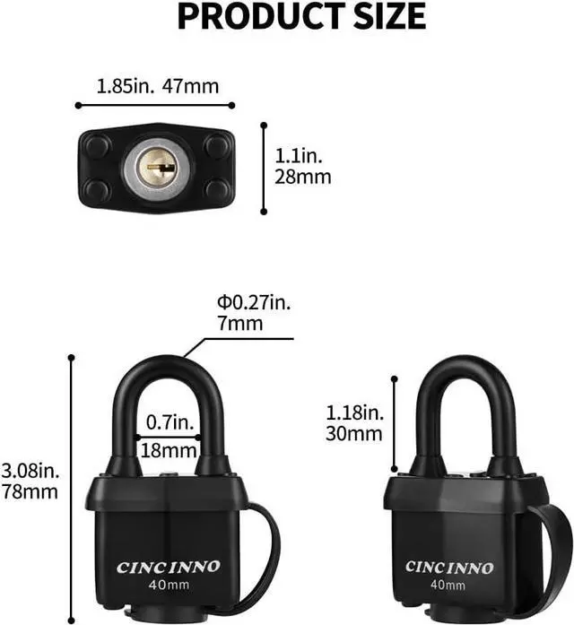 Widely Application: CINCINNO weatherproof Padlocks for outdoor and indoor use. It's best used for sheds, storage unit, gate, fence, toolbox, locker and more.